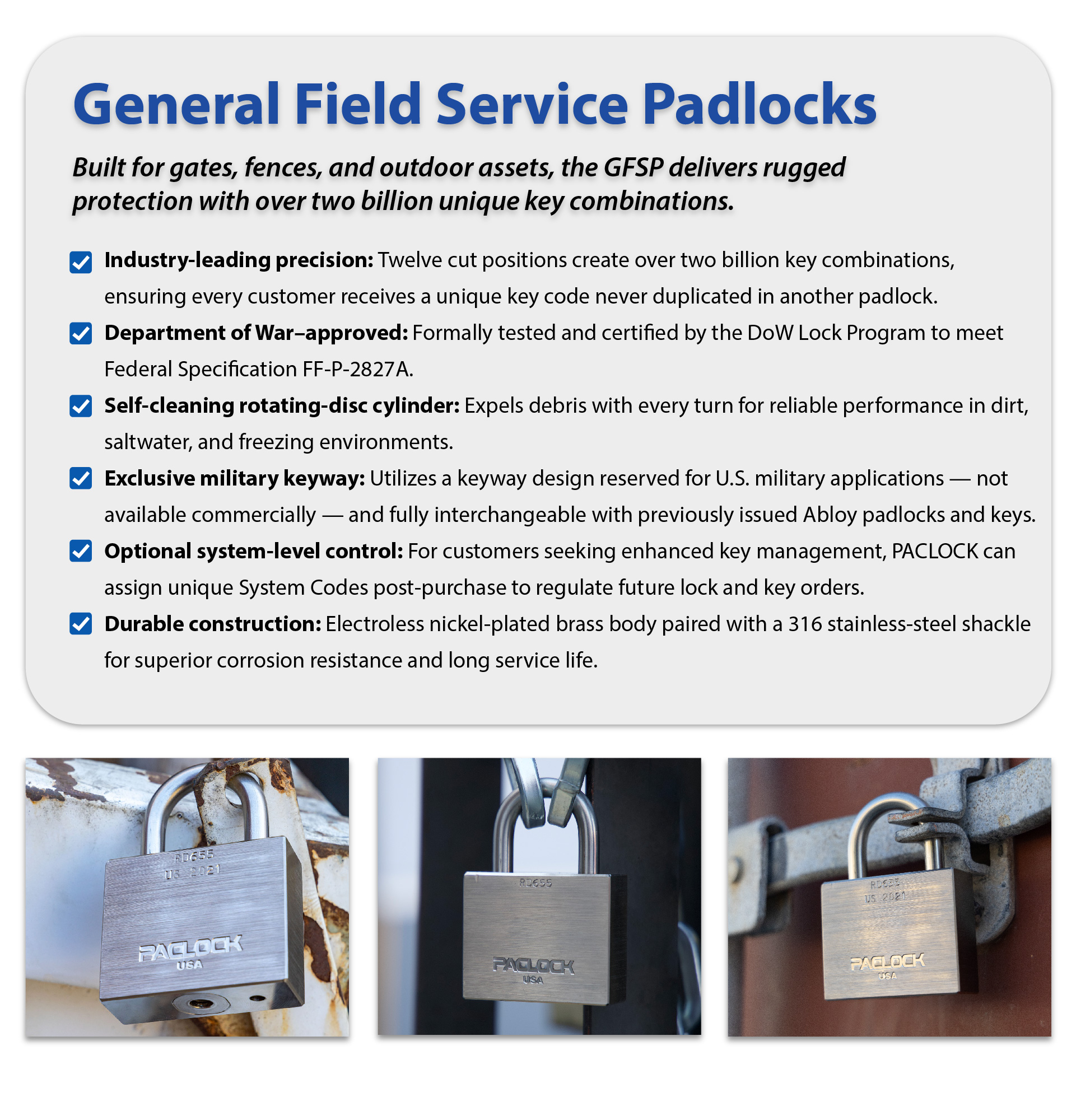 PACLOCK is the only U.S. manufacturer certified to produce all three military padlock grades: high, "GFSP", and low. Trusted to protect arms rooms, gates, storage units, and other assets. Read our press release!