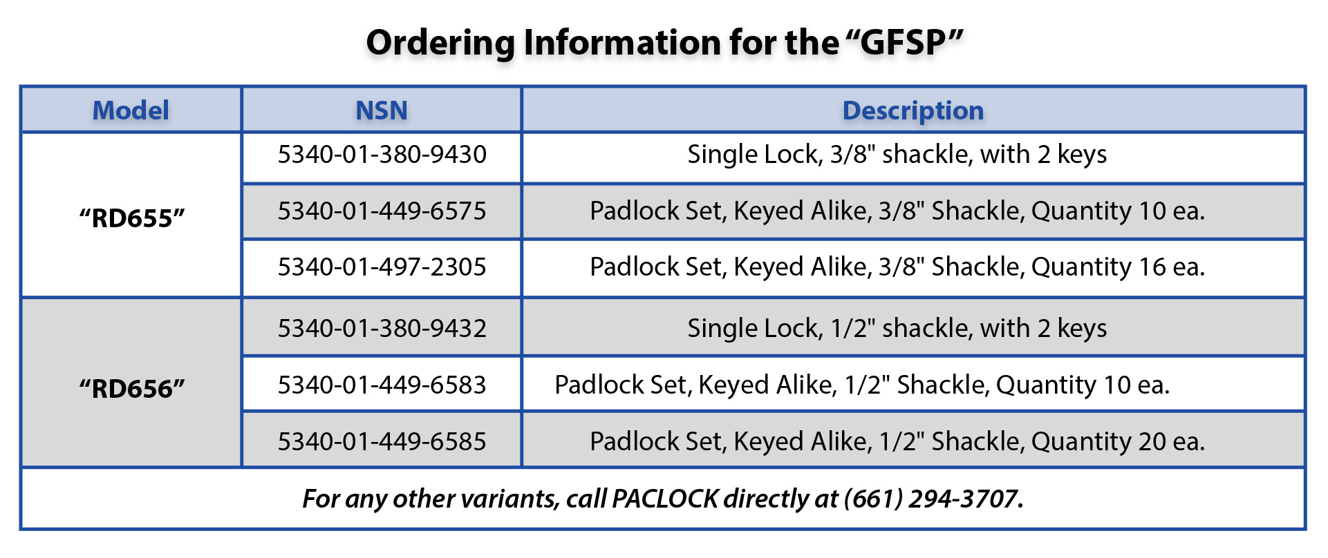 Ordering Information for the "GFSP" Padlock & Keys
