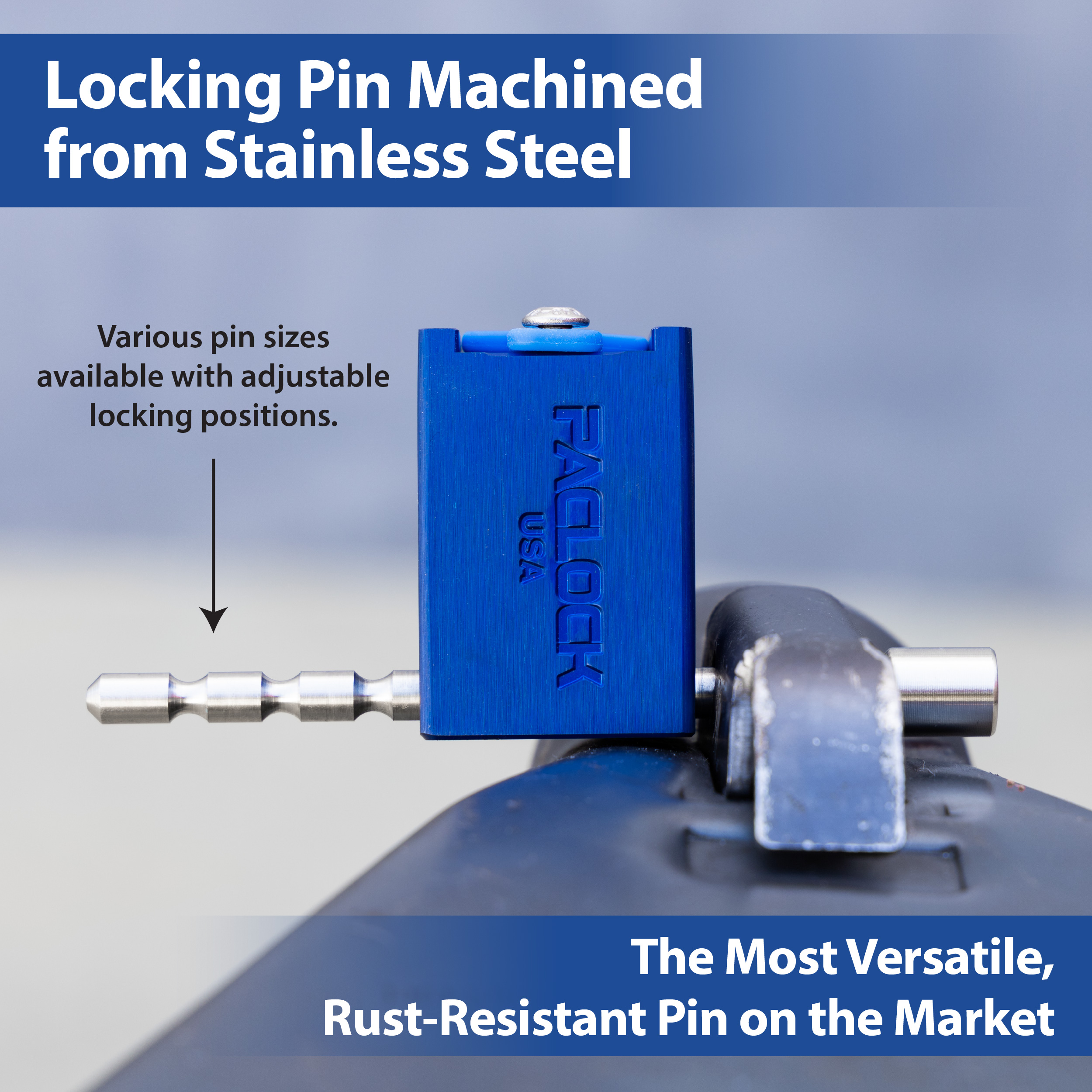 PACLOCK’s “79-Series” is a versatile trailer lock that can be utilized on a variety of applications! Also considered to be a universal trailer lock, it can be used on boat trailer couplers, kayak trailers, and more. A variety of interchangeable stainless steel pins are available depending on your application – the “338” pin is particularly great for 1-Up® Super Duty bike racks! See the tech data graphic for “Pin Types.”