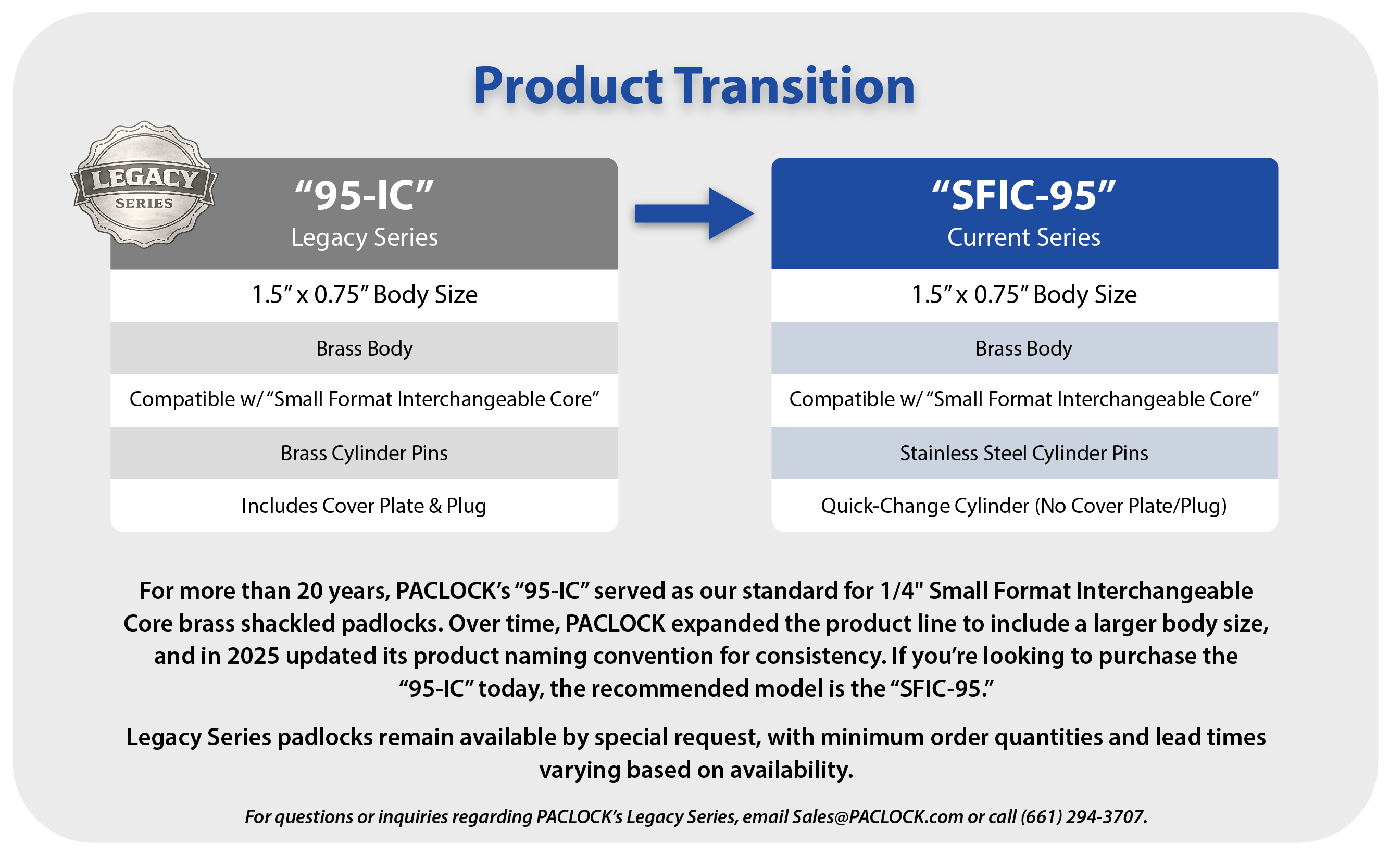 The “95-IC” is part of PACLOCK’s original Legacy Series and is now offered only in limited, special-order situations. Minimum order quantities and lead times vary based on availability. Please contact PACLOCK directly for inquiries, or learn more about the Legacy Series and recommended replacement products.