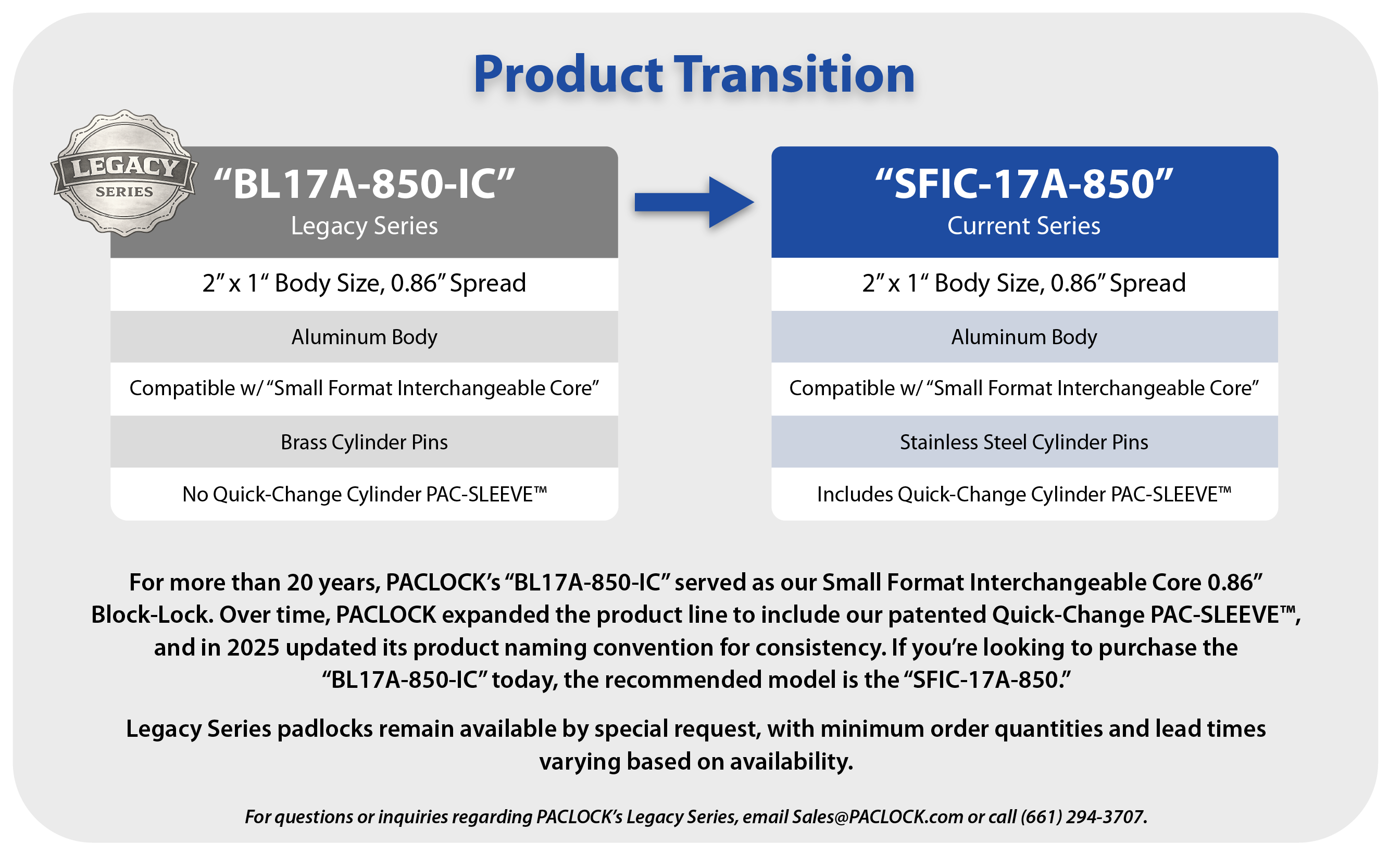 The BL17A-850-IC is part of PACLOCK’s original Legacy Series and is now offered only in limited, special-order situations. Minimum order quantities and lead times vary based on availability. Please contact PACLOCK directly for inquiries, or learn more about the Legacy Series and recommended replacement products.